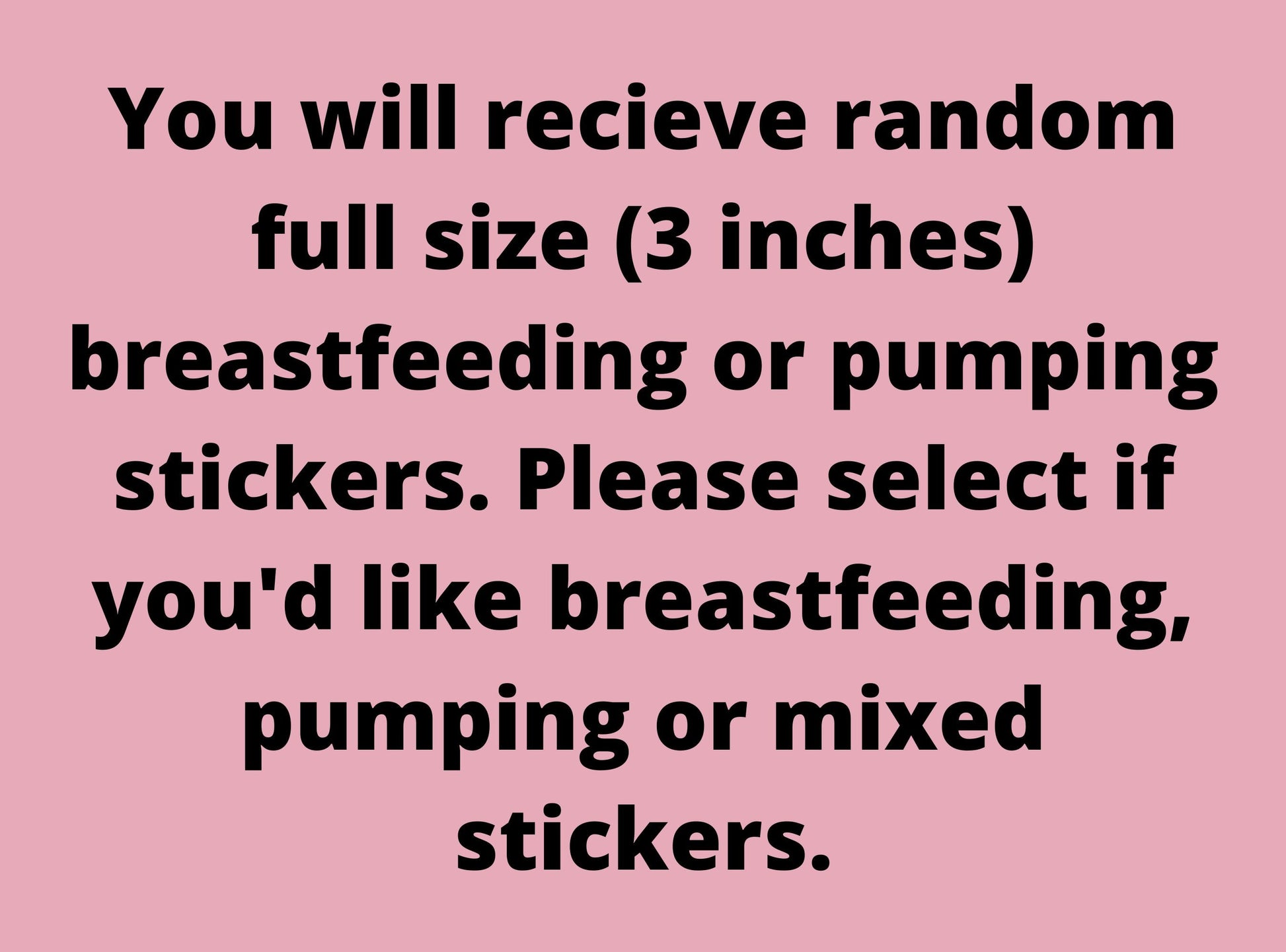 You will receive random breastfeeding or pumping stickers. They will be approx 3 inches at their longest point.