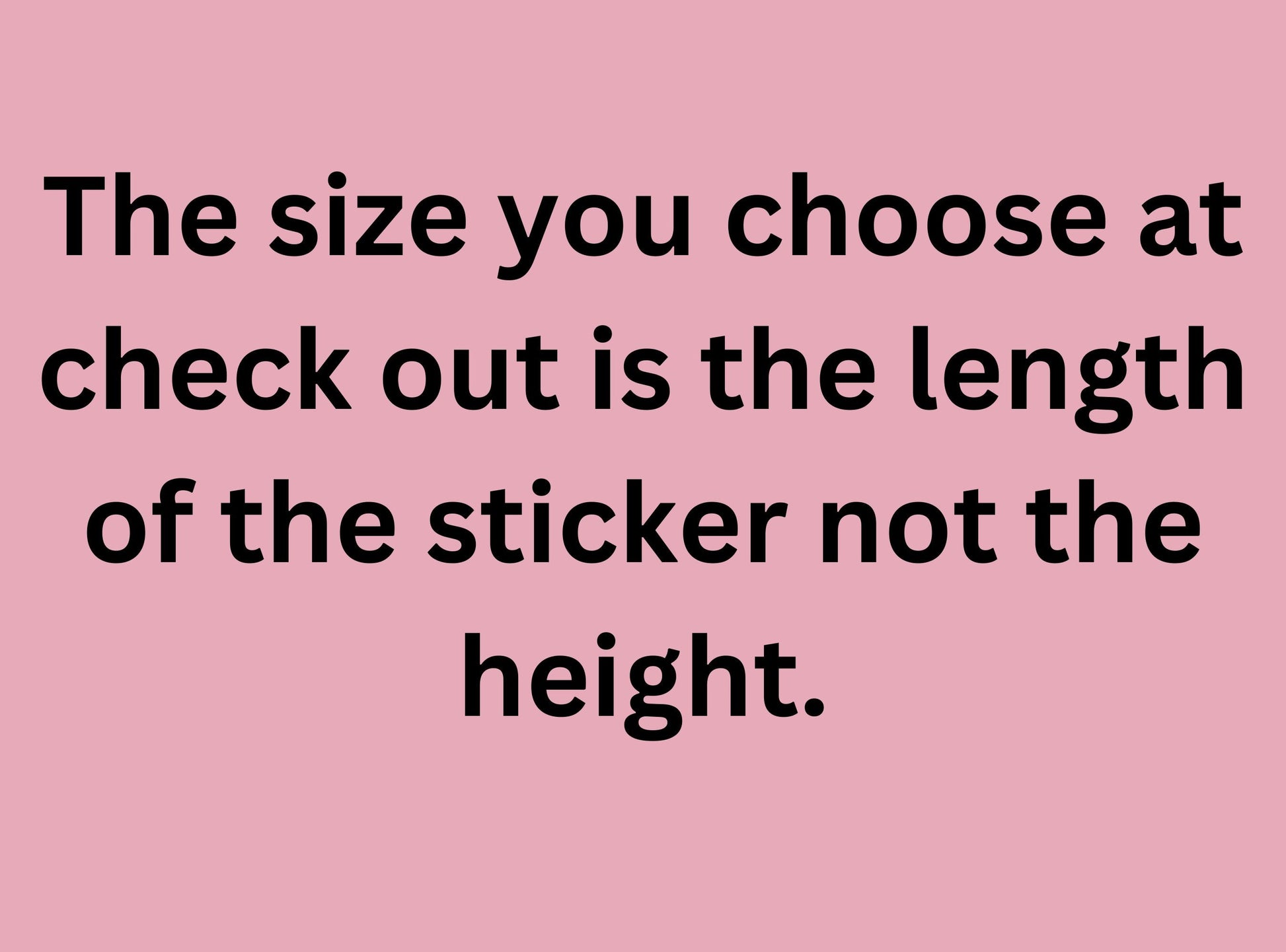 PLEASE NOTE THE SIZE YOU CHOOSE IS THE LENGTH OF THE STICKER NOT THE HEIGHT. THE HEIGHT WILL VARY BASED ON HOW MANY CHARACTERS ARE IN YOUR NAME. SHORTER NAMES WILL BE TALLER LONGER NAMES WILL BE SHORTER.