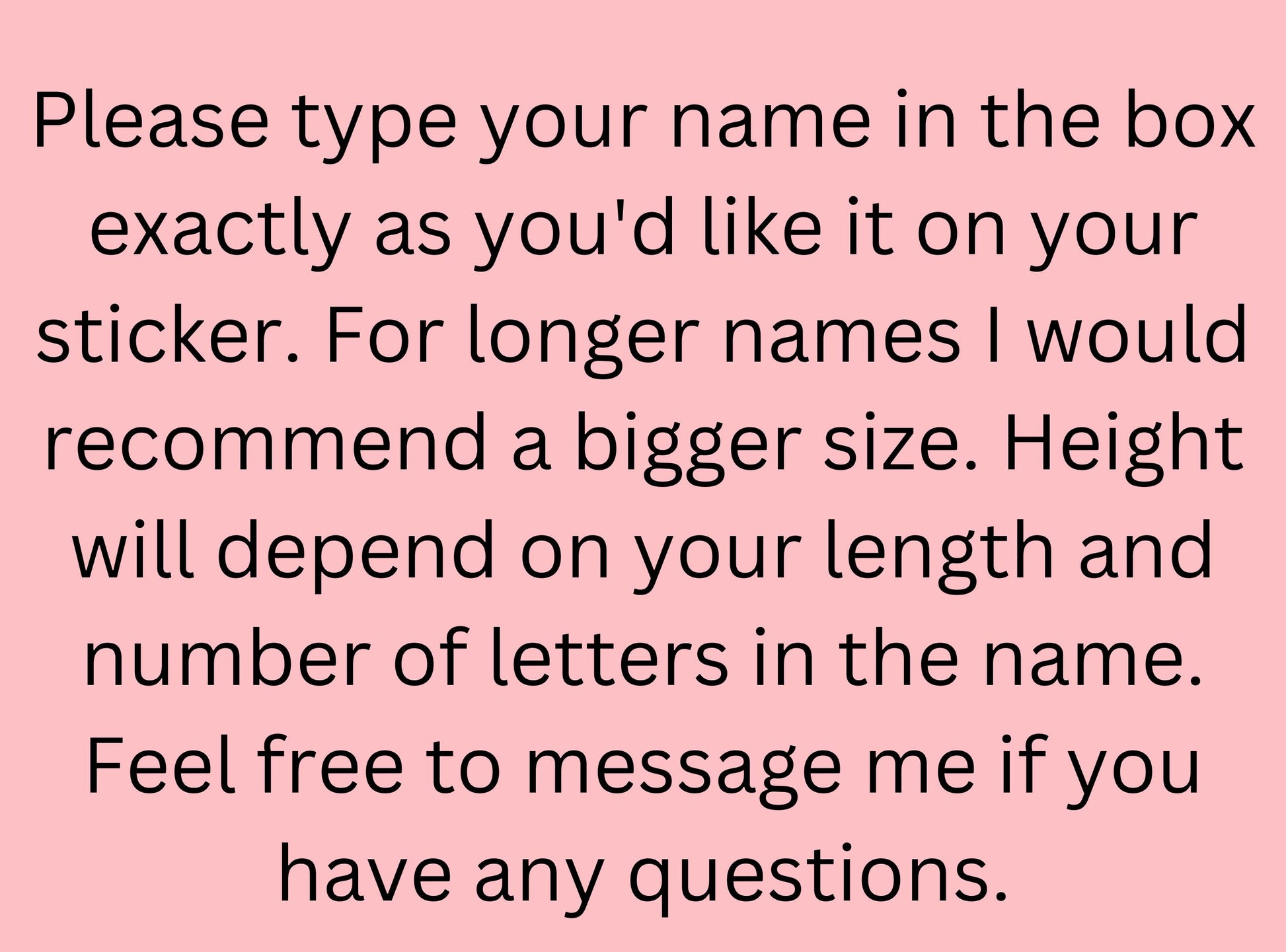 PLEASE NOTE THE SIZE YOU CHOOSE IS THE LENGTH OF THE STICKER NOT THE HEIGHT. THE HEIGHT WILL VARY BASED ON HOW MANY CHARACTERS ARE IN YOUR NAME. SHORTER NAMES WILL BE TALLER LONGER NAMES WILL BE SHORTER.