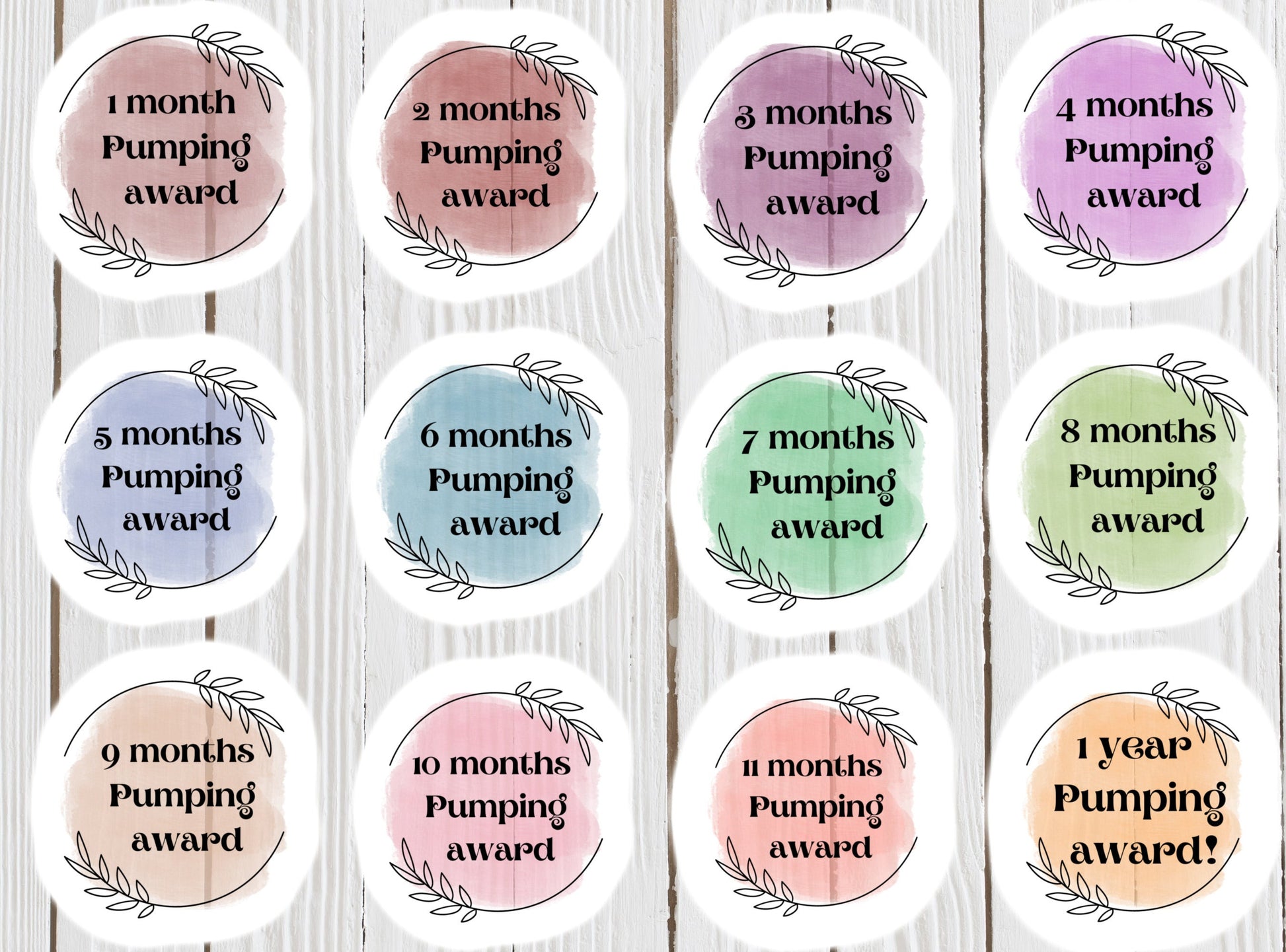 Pumping award stickers. Celebrate each month with these fun tickers! Display them on your pump or water bottles! Each sticker will be about 2 inches at its longest point.